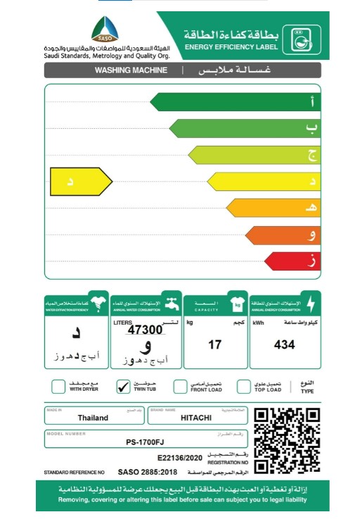 غسالة حوضين هيتاشي 17 كيلو غسيل (ابيض غطاء بني) موديل PS- 1700FJDBR(ME)