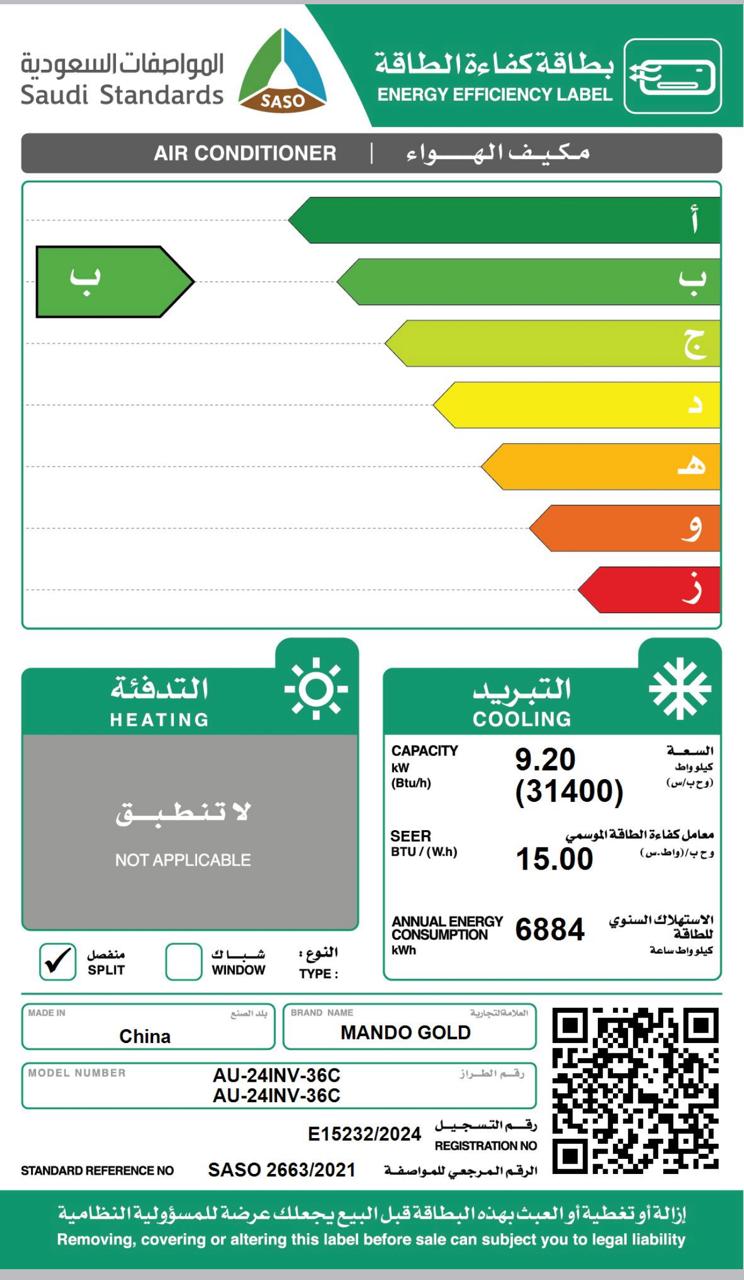 مكيف اسبيلت ماندو جولد 36 بارد انفرتر قدره تبريد 31400 AC-GD-24INV-36C -AU-24INV36C