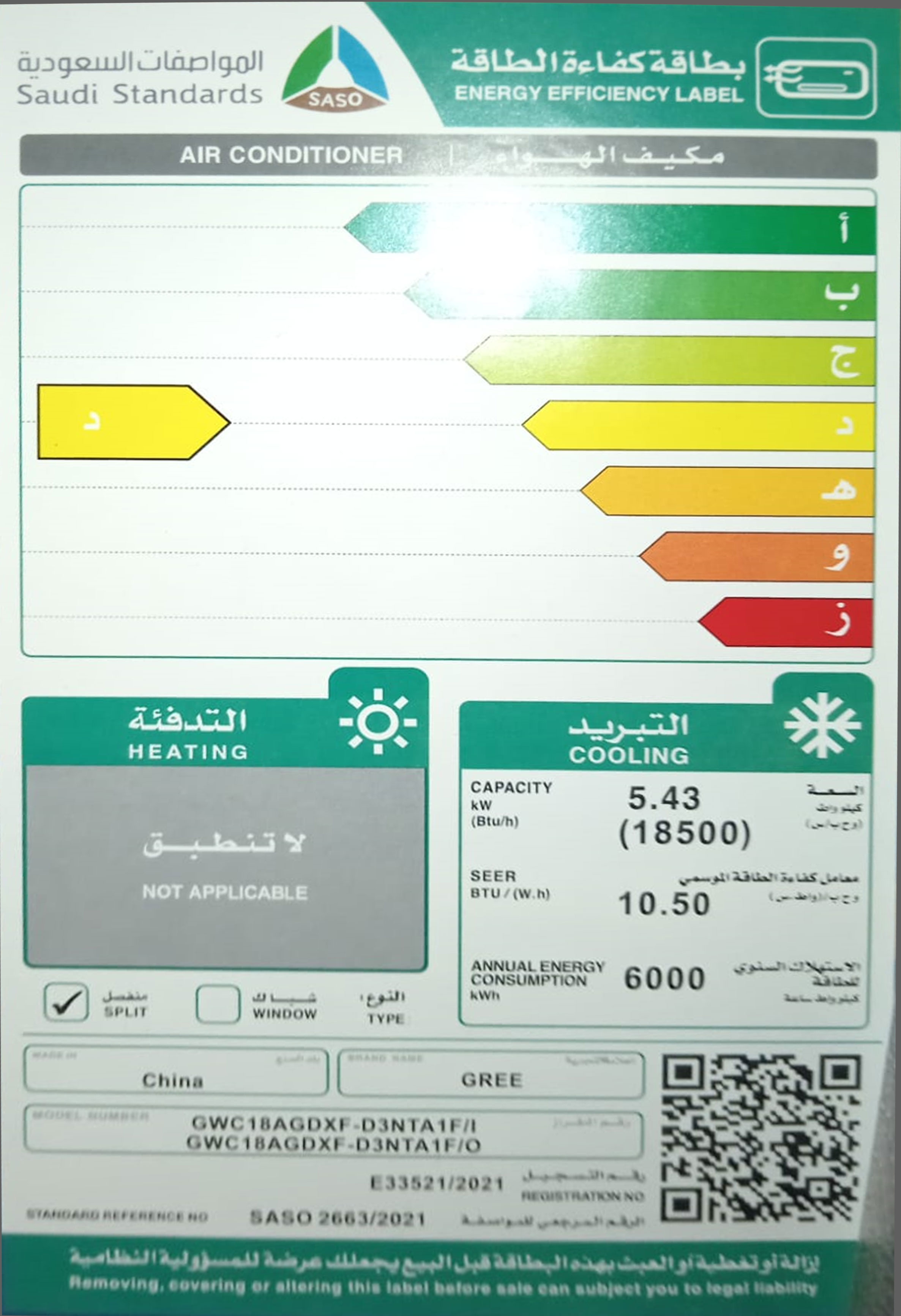 سعة التكييف حسب كارت الكفاءة: 18500 وحدة