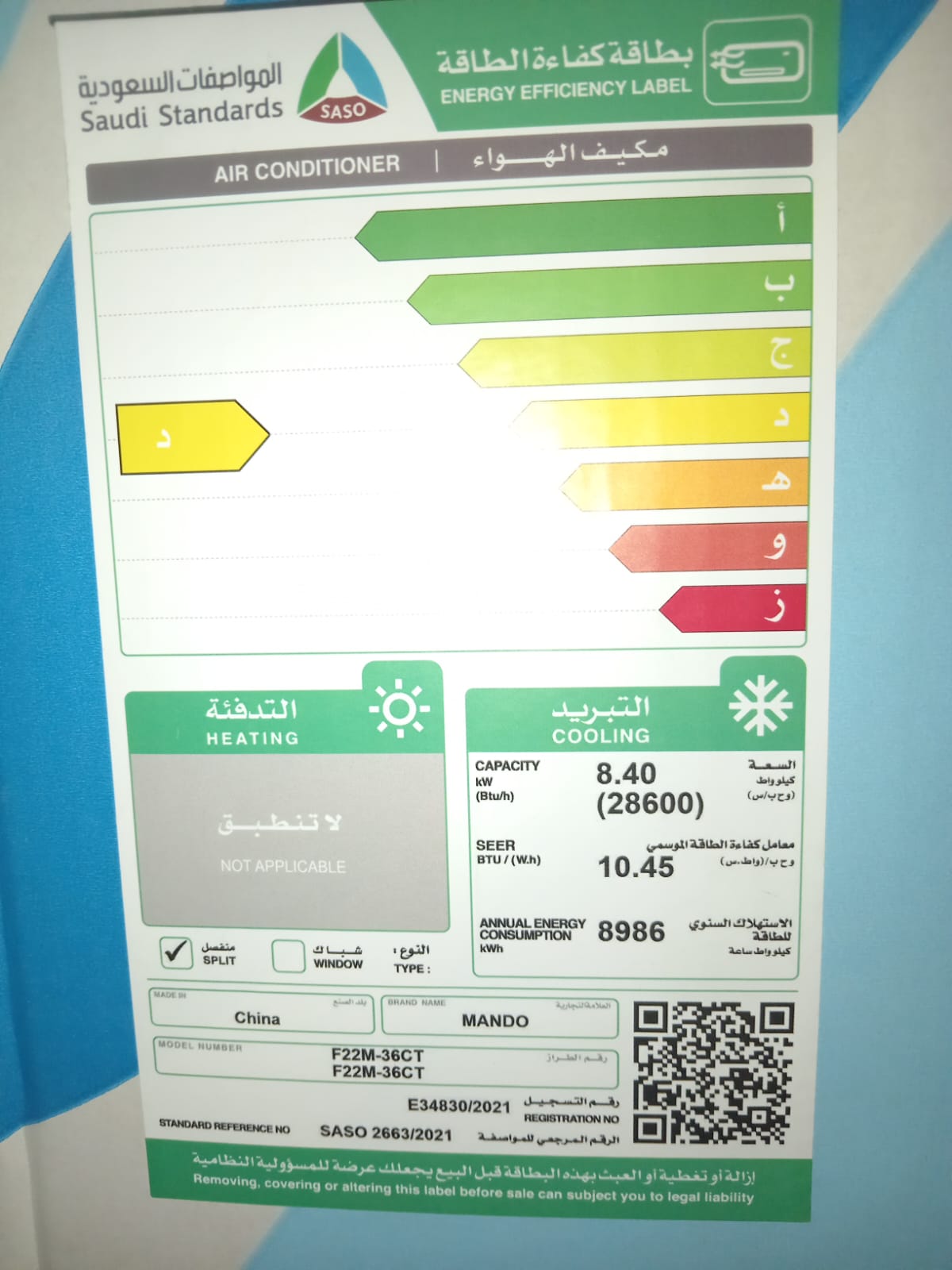 • فريون 410: يستخدم المكيف فريون 410 كوسيط تبريد، وهو وسيط تبريد صديق للبيئة